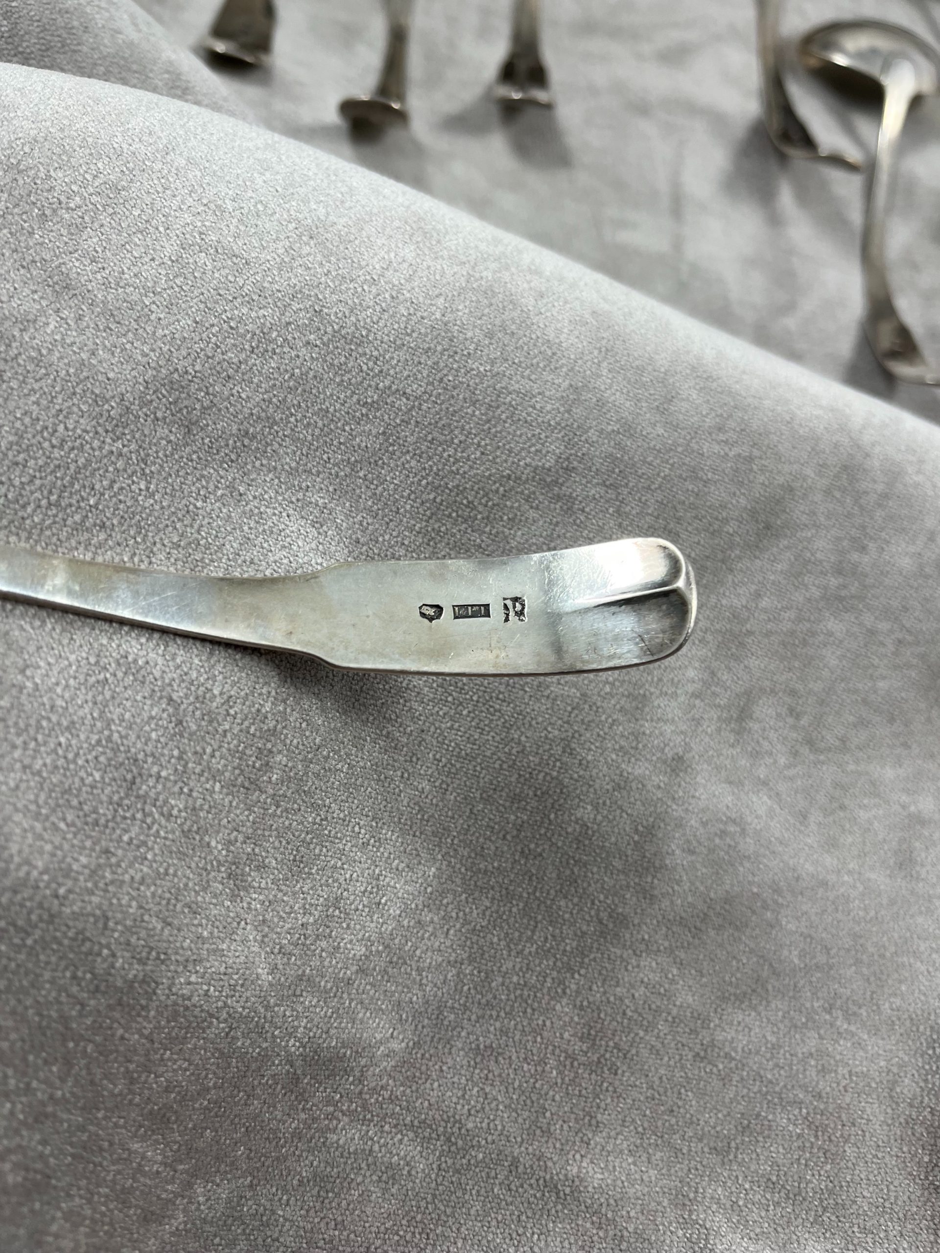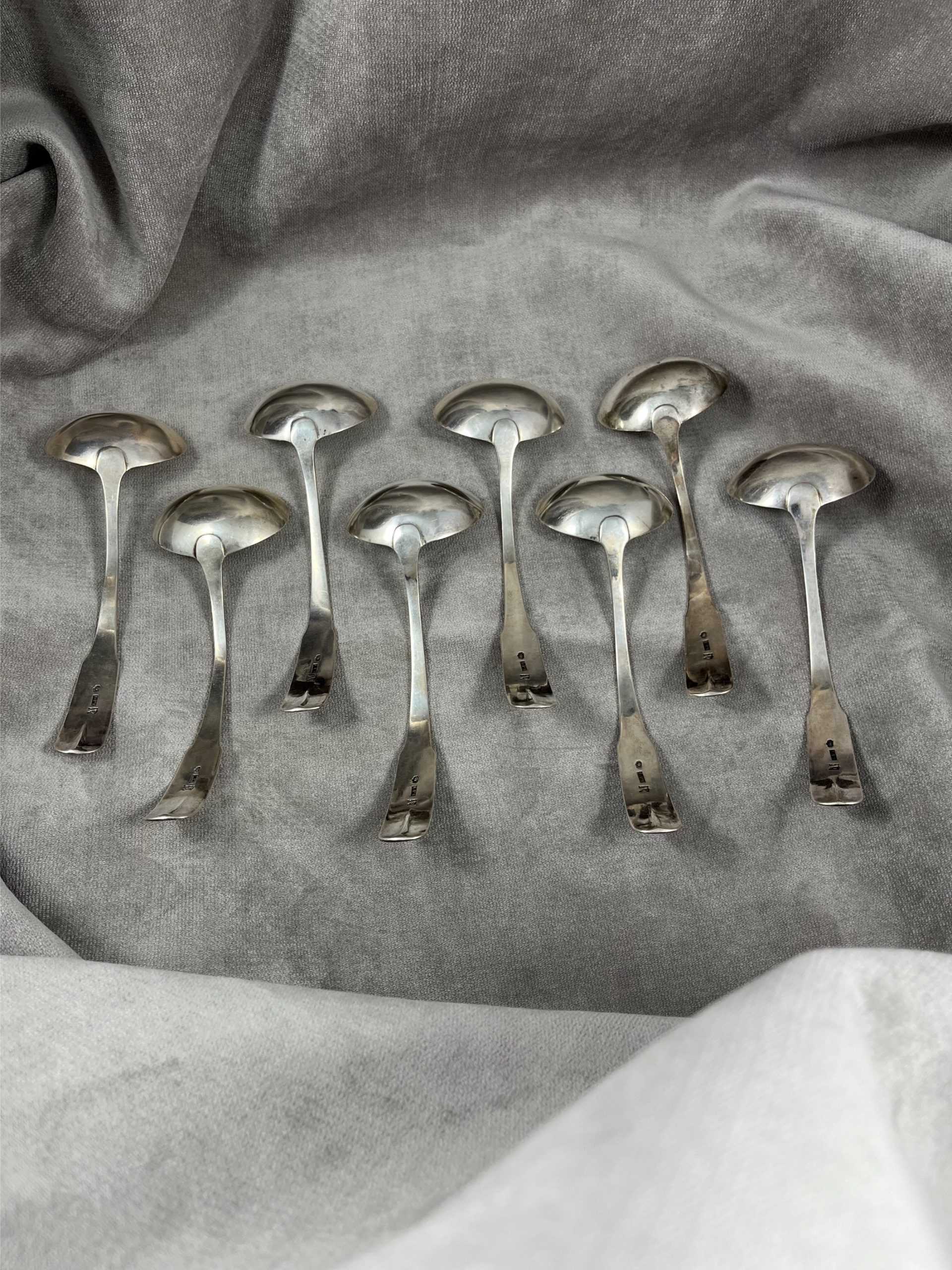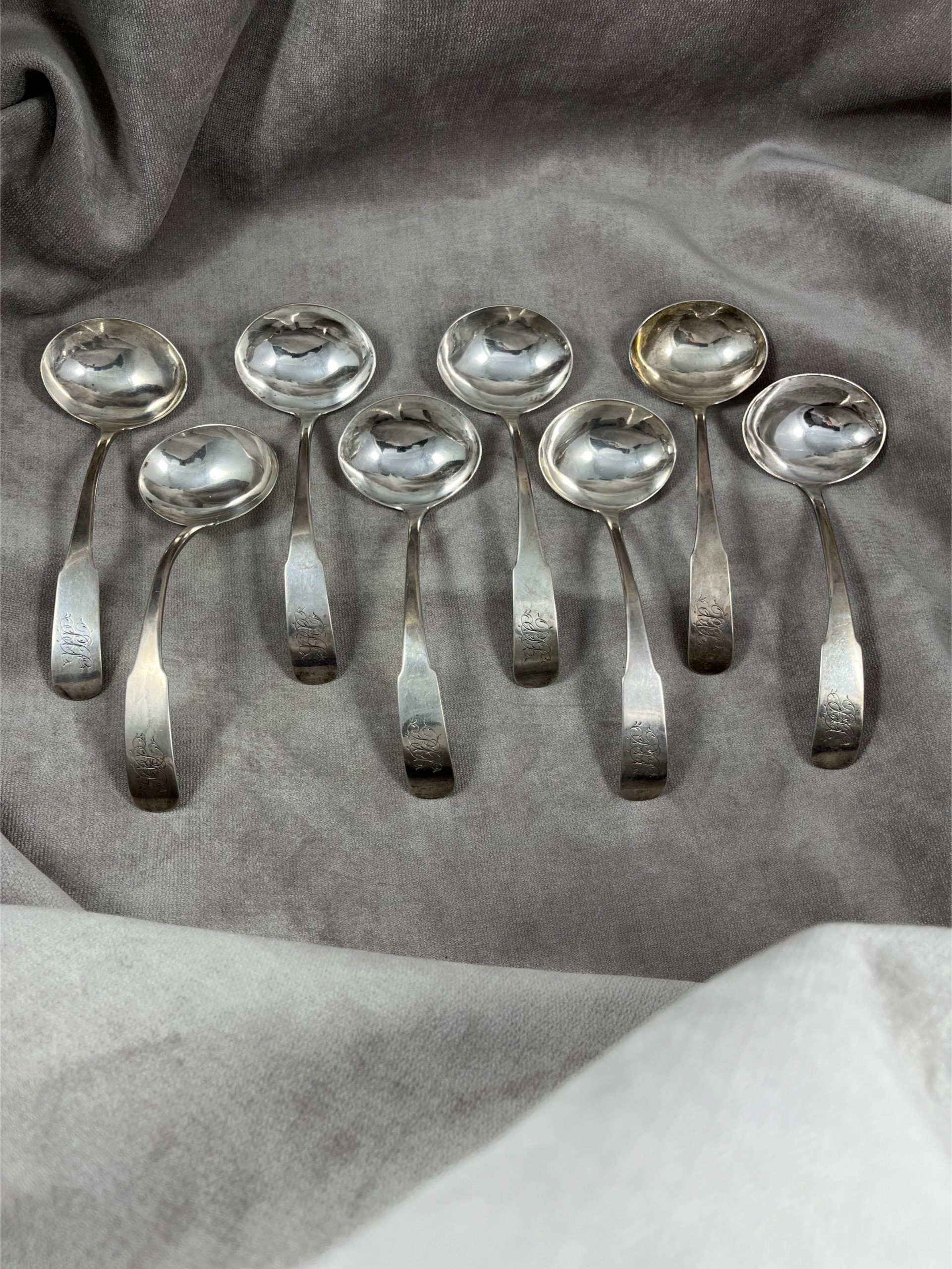A rare set of eight sauce ladles by John and his brother Peter Targee. These were made in New York during the years 1809-1814 when they were partners. Peter died in 1814 at the age of 35. These lovely spoons measure 7 inches and weigh 11 Oz. 7 Dwt. They were almost certainly made as sauce ladles, but they would also make fine (if a little large) soup spoons !