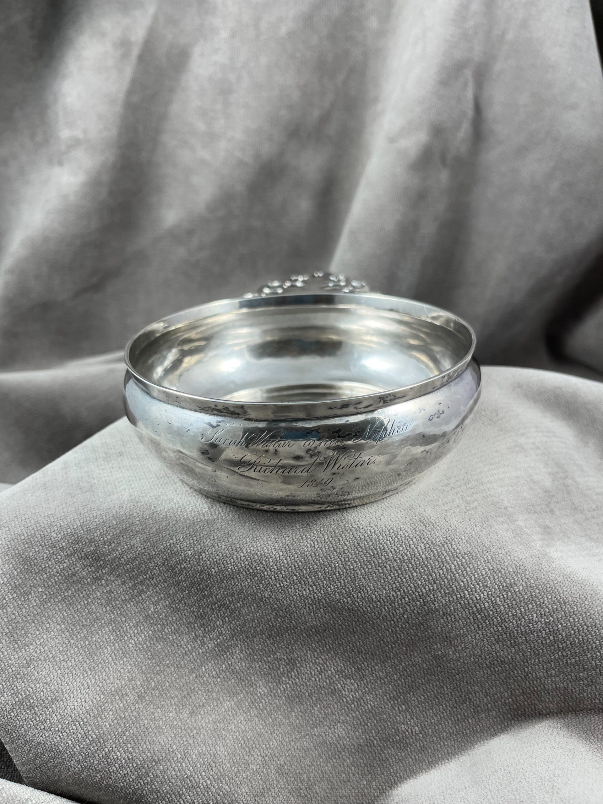 Great early Philadelphia porringer by Joseph Richardson Sr. This was made circa 1738. It was made for Caspar and Catherine Wistal. This piece is from a set of 4. It is illustrated in Joseph Richardson and Family Philadelphia Silversmiths by Martha Gandy Fales, page 120. It weighs 7 Oz. 5 Dwt. and measures 7 inches across the top including the handle.