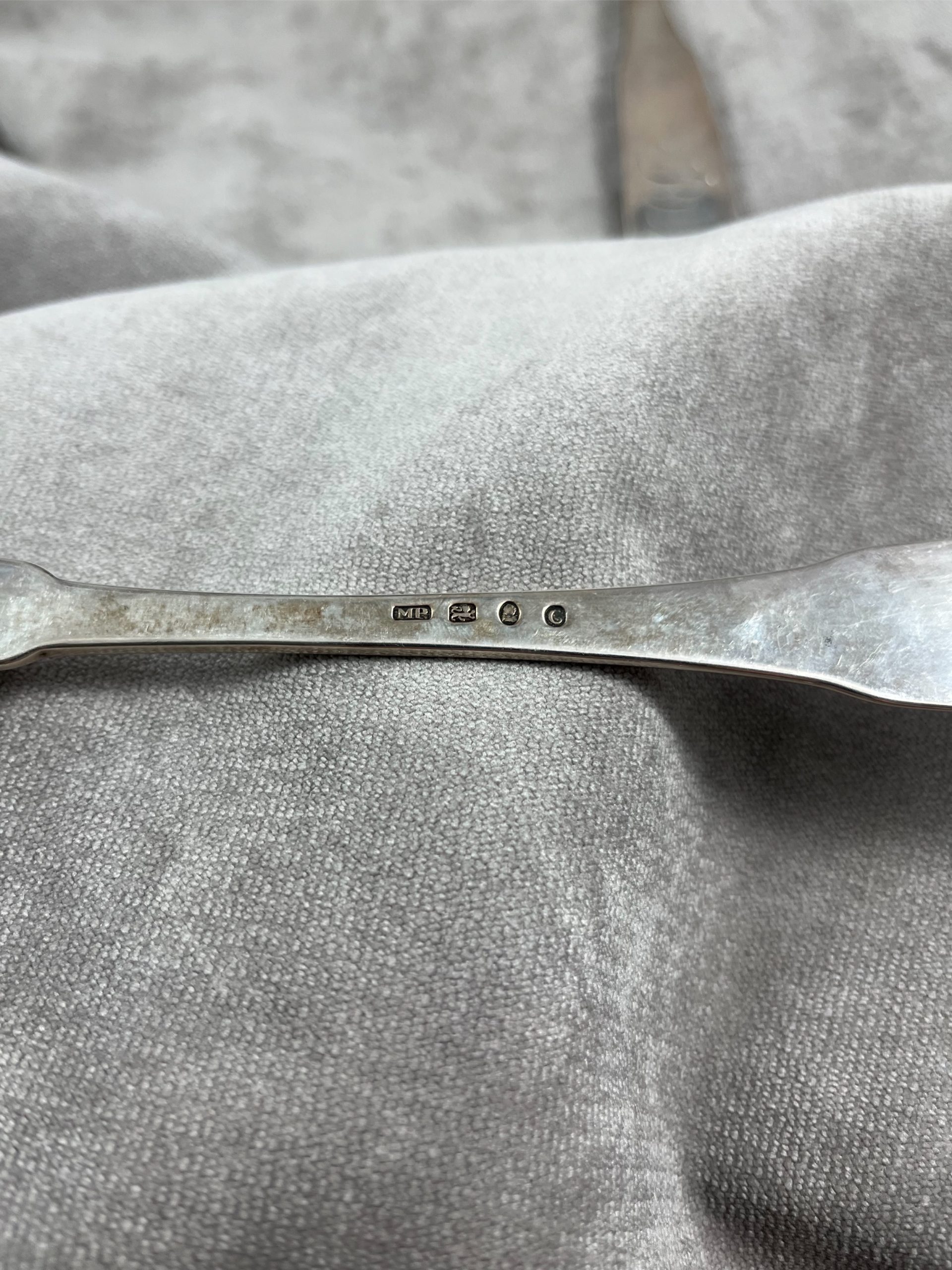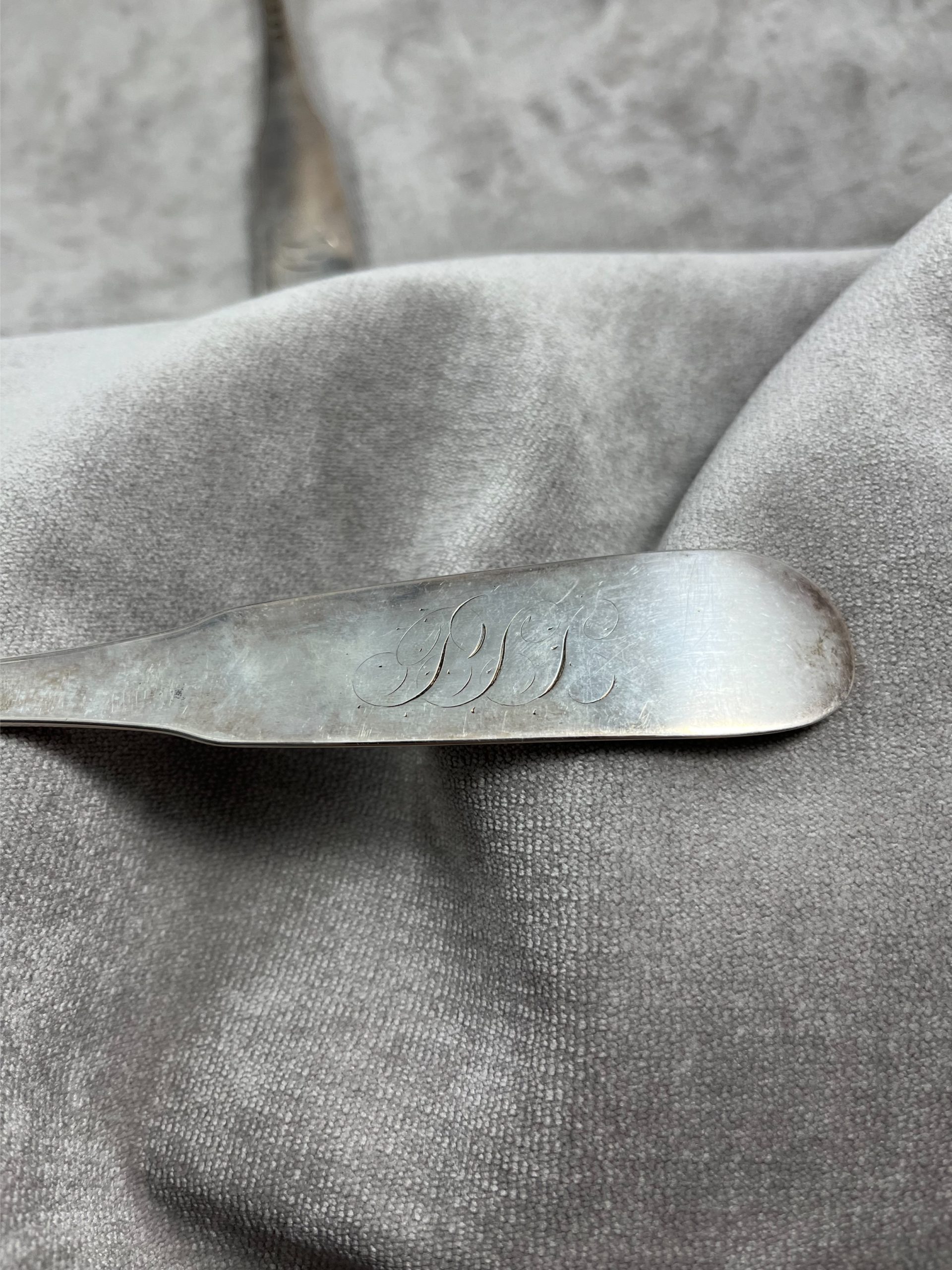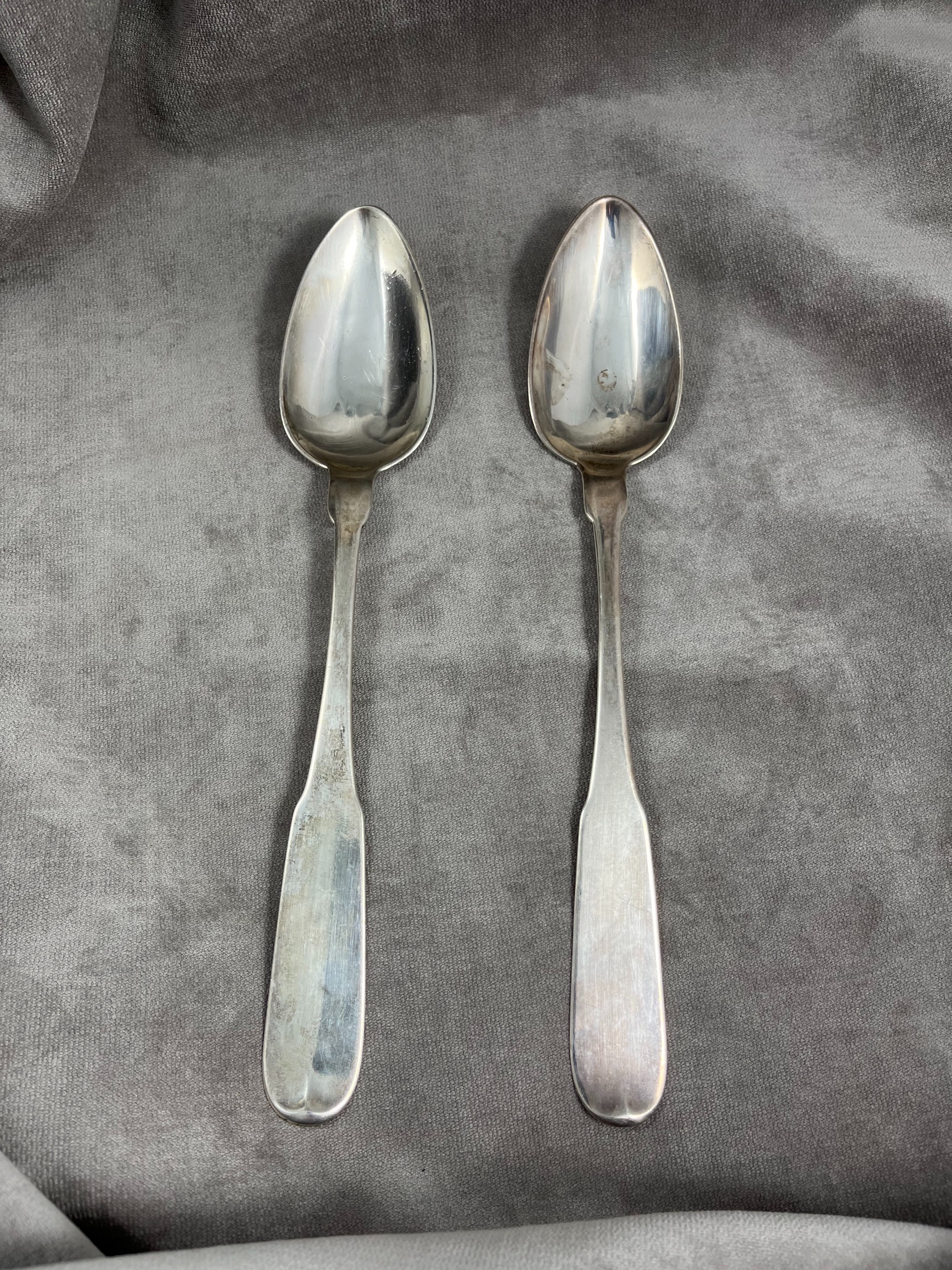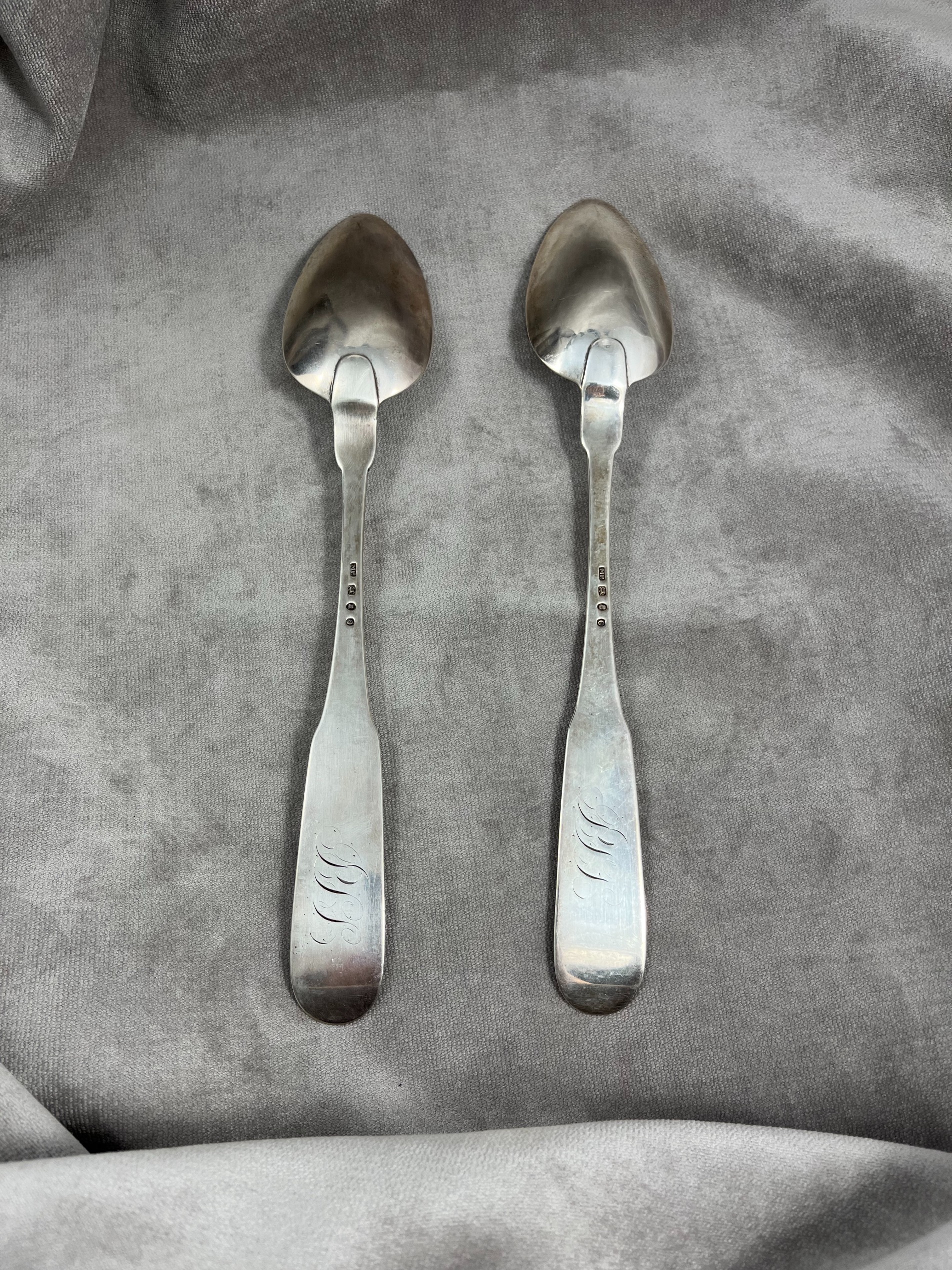 A pair of stuffing spoons by Maltby Pelletreau. He was the son of Elias Pelletreau Jr. and the grandson of Elias Pelletreau Sr. These probably date from 1812-1818 as he had partners for most of his career. Lovely spoons, they measure 11 1/4 inches in length and weigh 7 Oz. They would have been made in New York and bear typical spurious English marks including the lion passant walking right.
