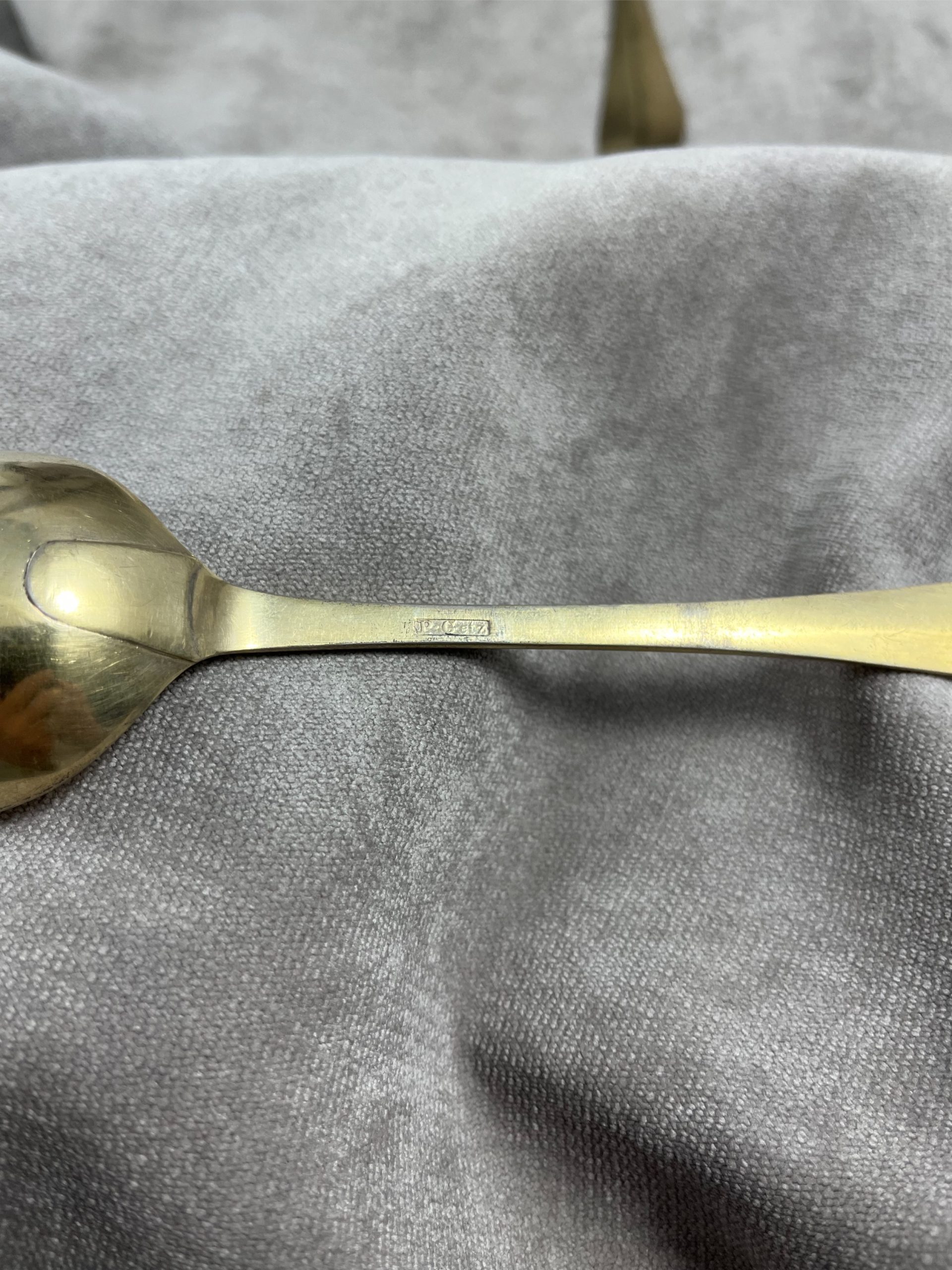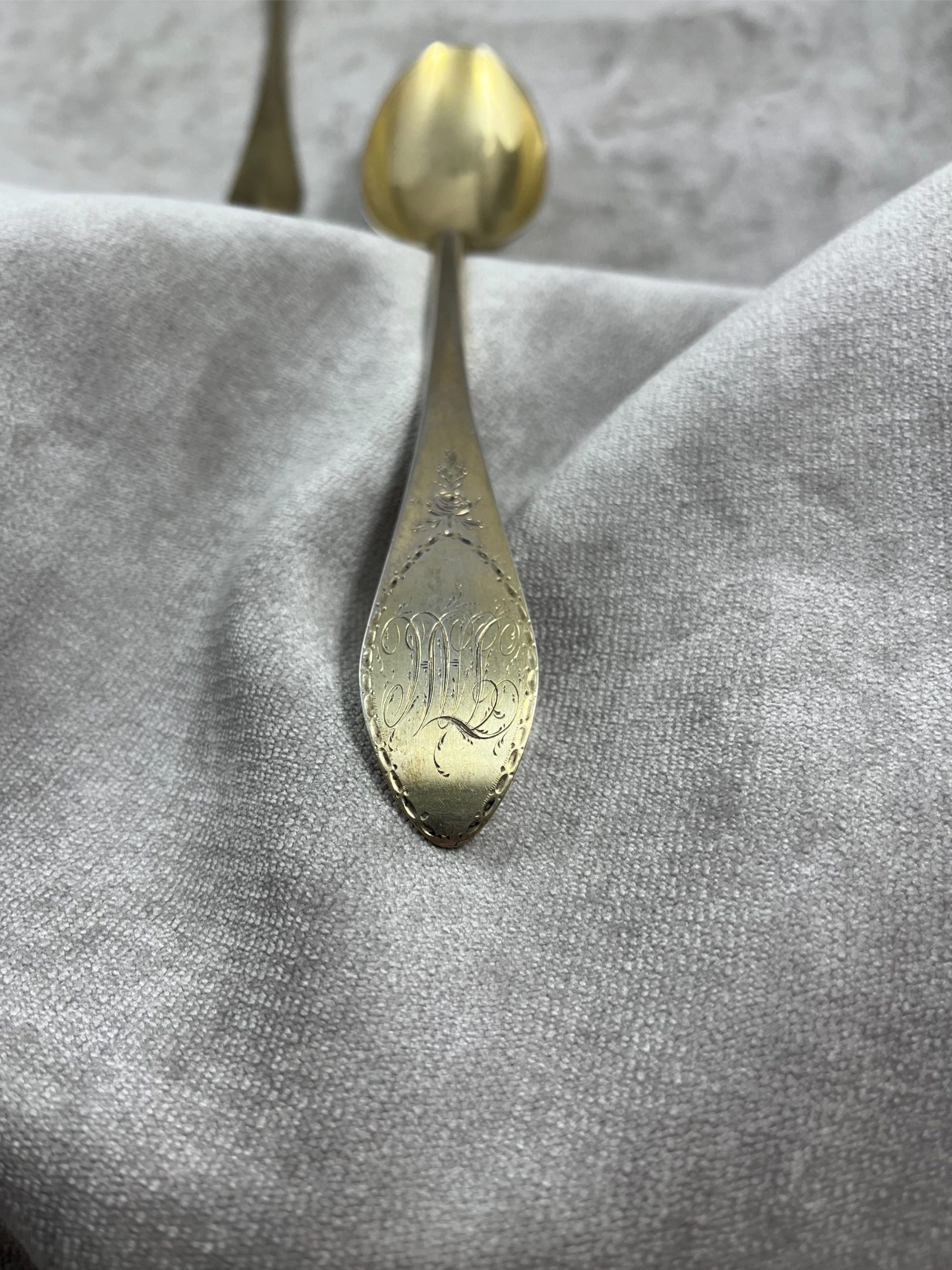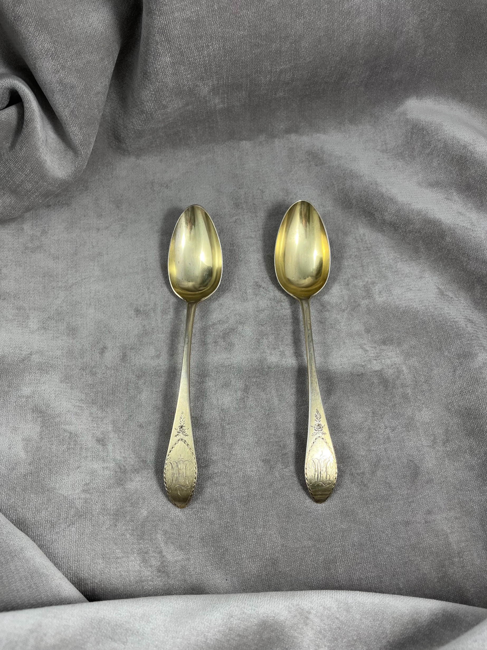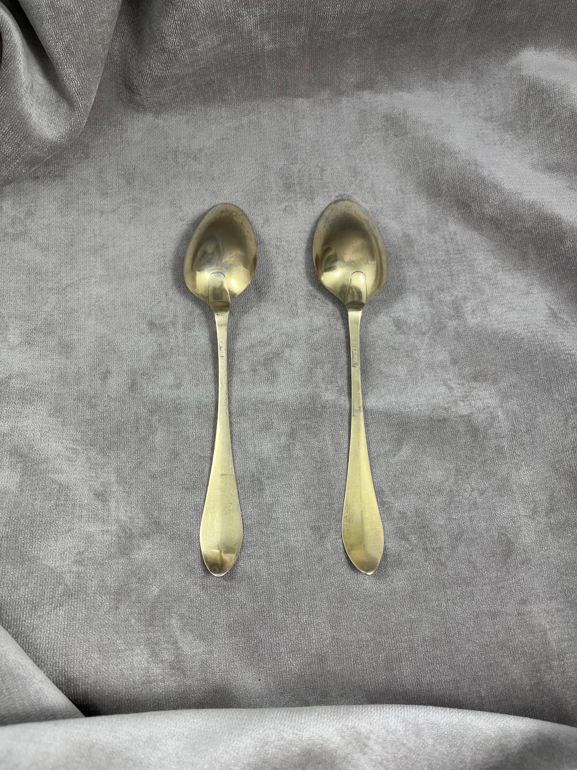 This is a very nice pair of tablespoons by Peter Getz. They were made in Lancaster, PA. about 1790. They measure 9 inches in length and weigh 3 Oz. 16 Dwt. Peter Getz is most famous today for creating the Getz (pattern) half dollars of 1792. These coin were privately made and are believed to have been proposals to Congress for a half dollar and cent, before the Philadelphia mint began producing coins. Today there are existing copper and silver specimens which can bring well into 6 figures for nice examples.These spoons show an old gold wash, most noticeably to the bowls.